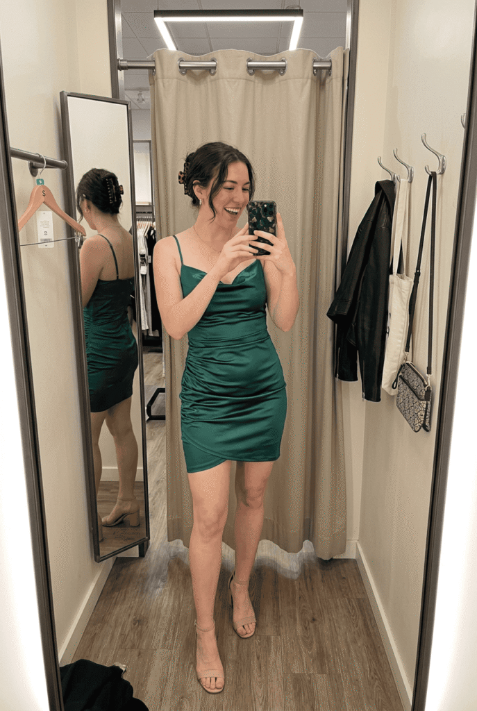 $89 at & Other Stories. The ruching on this is strategic — it gathers at the waist and hip, which is flattering on literally everyone I’ve seen try it. Emerald satin catches candlelight beautifully.