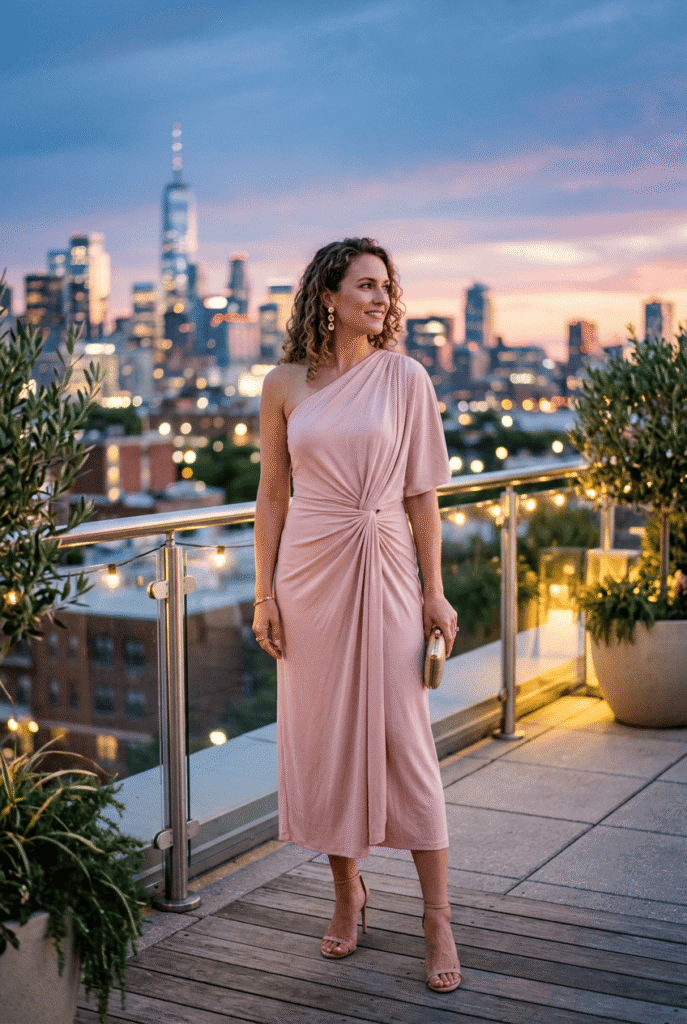 $72 at ASOS. Dramatic without trying too hard. The draping falls naturally, the blush tone is soft and romantic. Not great if you don’t like asymmetry, but if you do — this is stunning.