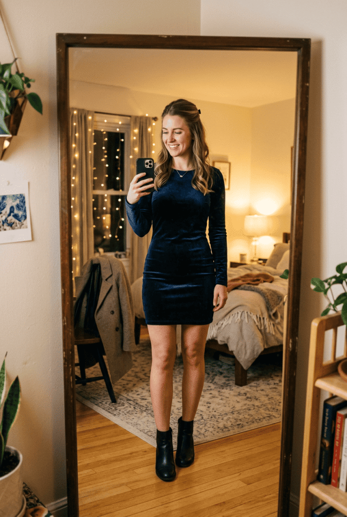 $79 at Abercrombie. Long sleeves + mini length is an underrated combination — it balances out perfectly. The velvet has real weight. Navy reads more sophisticated than black for a dinner date.