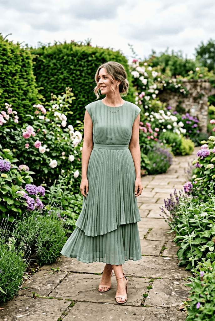 $168 at Anthropologie. Sage green is the color of the moment for weddings and this pleated chiffon version moves beautifully when you’re dancing. The pleats add visual interest without being fussy. Comfortable enough for a six-hour reception — I tested this personally.