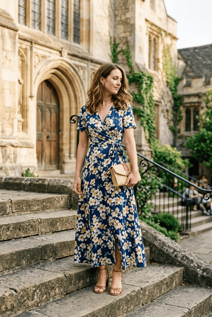 $248 at Reformation. Blue-based florals read wedding-appropriate without looking like you’re trying to match the bridesmaids. The wrap waist is adjustable and the maxi length keeps it formal enough for ceremonies.