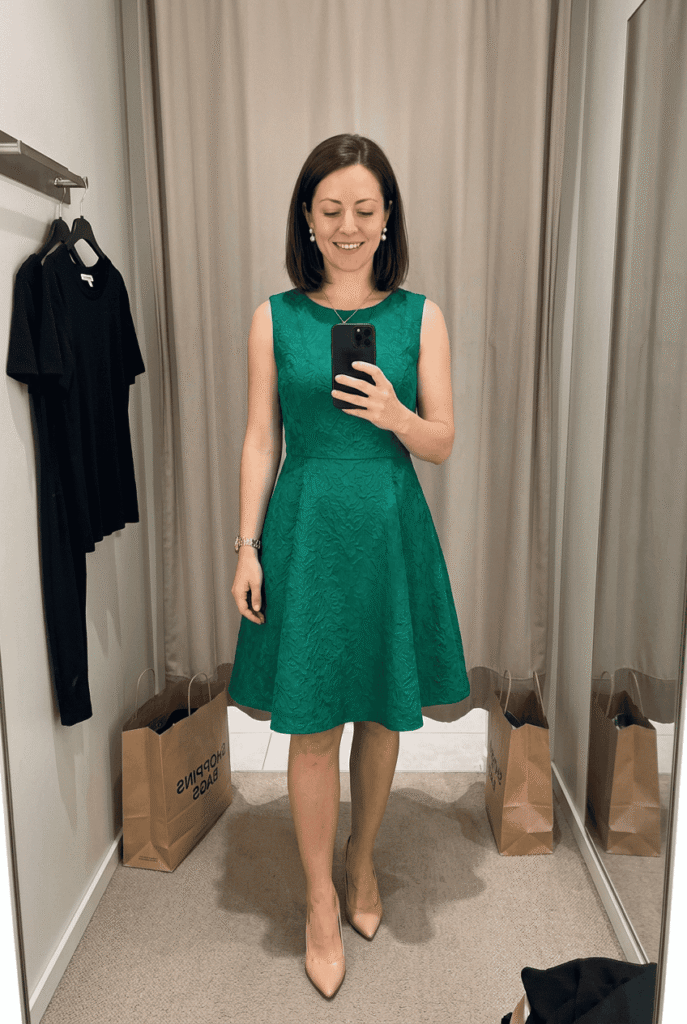 Around $245 at Ted Baker. The jacquard texture is woven, not printed — you can feel the quality. Fit-and-flare is universally flattering and photographs well from every angle. Worth it for wedding season.