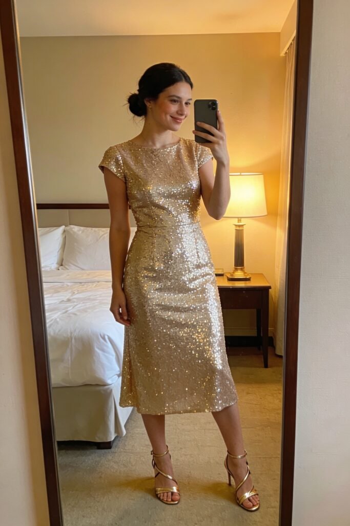 $280 at BHLDN. For the evening ceremony or New Year’s Eve wedding. Micro sequins catch light without looking costume-y. Cap sleeves add coverage without bulk.