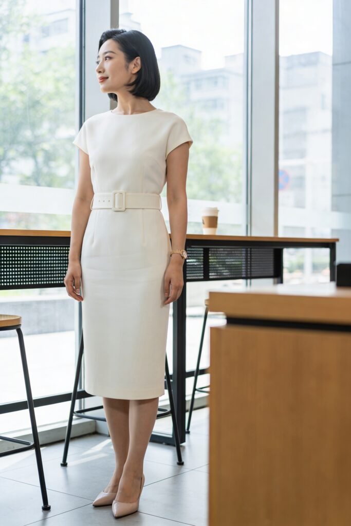 $245 at M.M.LaFleur. The crepe doesn’t wrinkle — tested this after a three-hour train ride. Ivory reads fresh and modern, the self-belt cinches the waist without hardware.