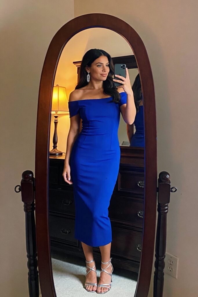 $199 at Karen Millen. Cobalt blue is bold enough for a cocktail party, polished enough for a work gala. Off-shoulder adds drama. Size up if broad-shouldered.