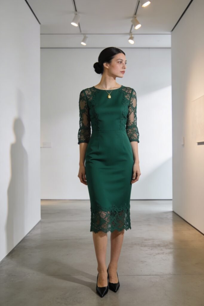 $325 at Sandro. Lace panels at the sleeves and hem. Forest green is unexpected and reads rich in person. Pencil silhouette is classic without being boring.