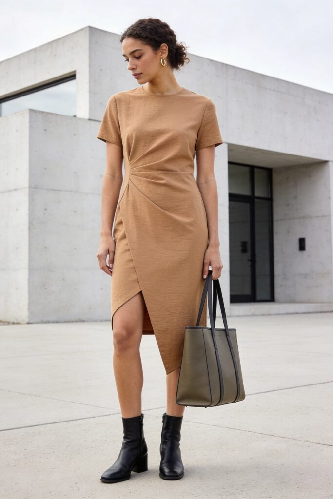 $115 at COS. Minimalist, architectural, interesting. The asymmetric hem gives it a contemporary edge. Camel is neutral enough for any professional setting.