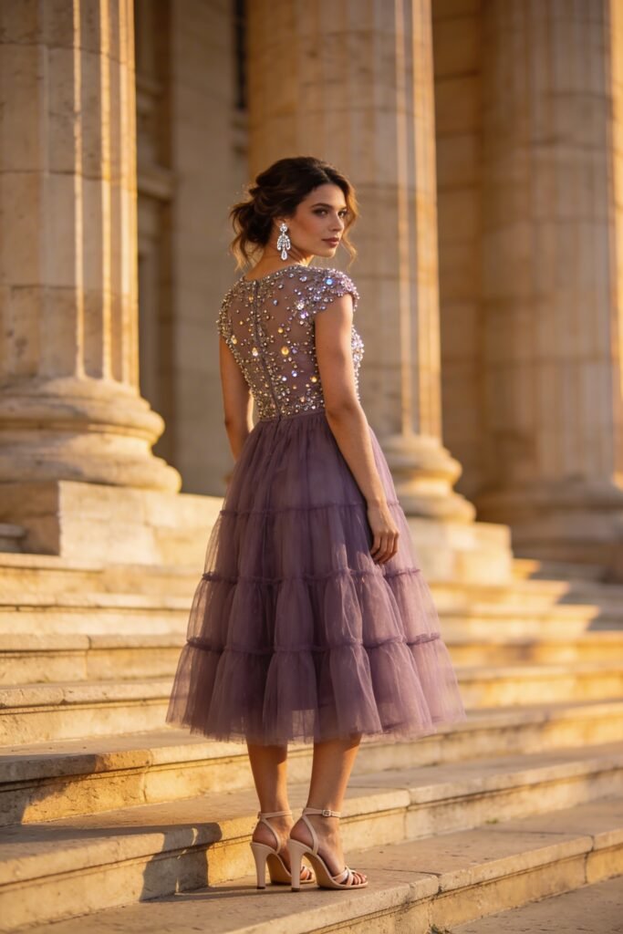 $450 at BHLDN. Hand-sewn beading on the bodice catches every light in the room. Dusty lavender is softer than classic lilac. The tulle is layered enough to feel full without prom-dress volume.