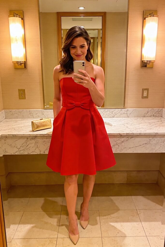 $495 at Saks. Red at a gala is a power move. The bow at the waist is proportional — elegant, not costume. Strapless bodice is genuinely structured enough to stay up through dinner and dancing.
