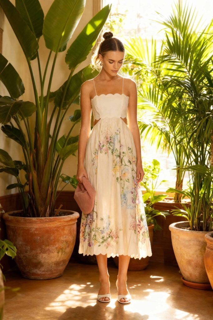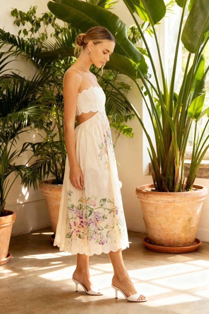 - Key Details: Zimmermann’s linen is thicker and softer than high-street linen. This dress features intricate embroidered scallop edges, waist cutouts, and an open back.