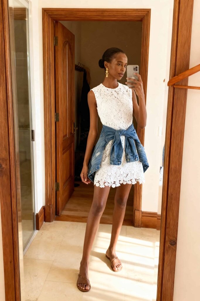 - Styling Ideas: Lace-up sandals and a raffia clutch.