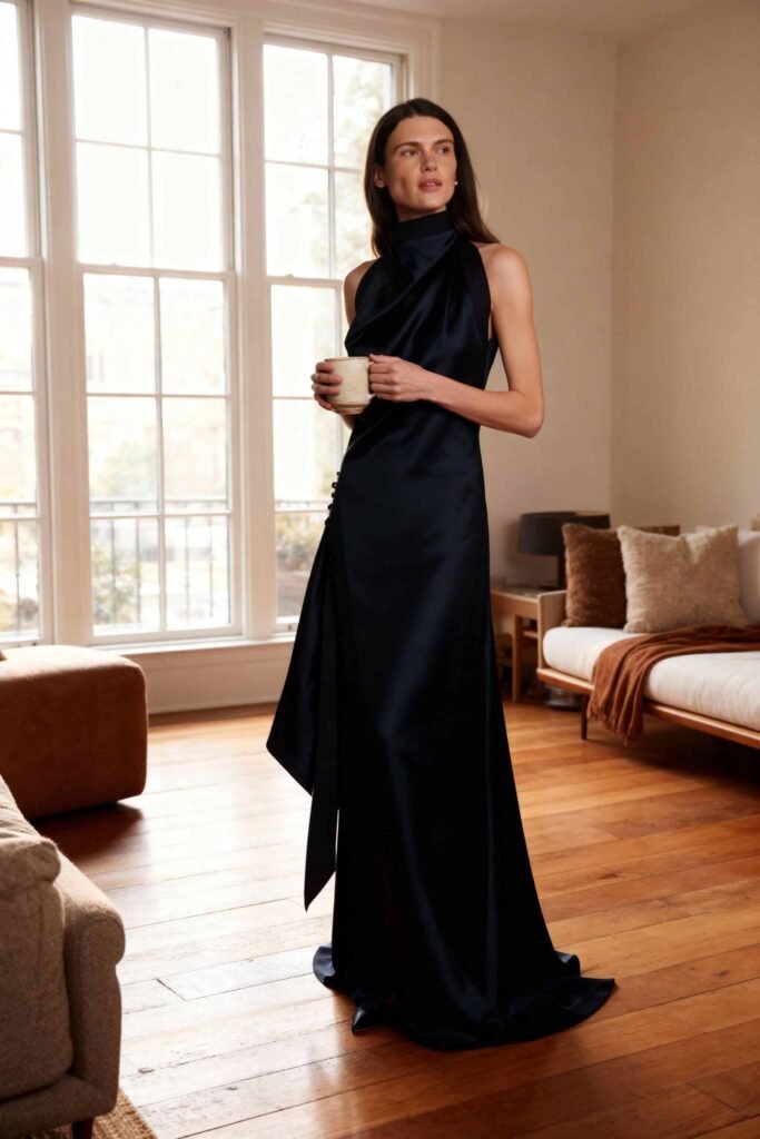 - Key Details: The “Pandora” neckline is a high halter that ties at the back, creating a long, fluid line. The satin is heavy and bias-cut.