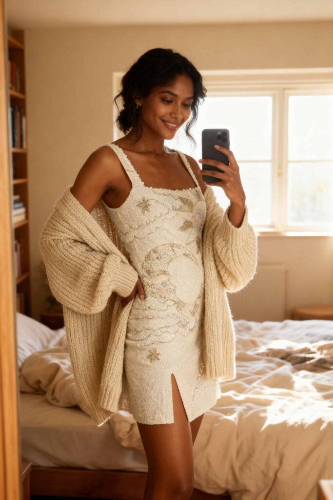 - Key Details: A fully sequined wrap dress with a velvet tie belt. It’s heavy (approx 3-4 lbs) due to the density of the beadwork.