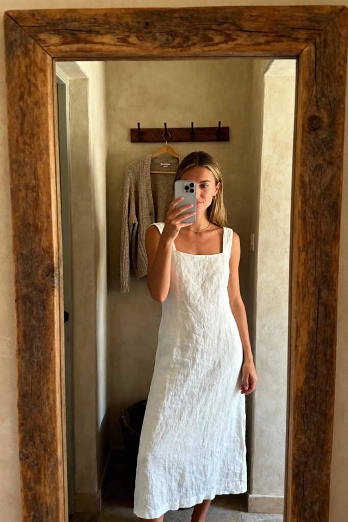 - Snapshot: Best for Winery/Estate shoots. Milkmaid/Square neck. Linen blend. Midi length. Sizes US 2–12. Cold wash.