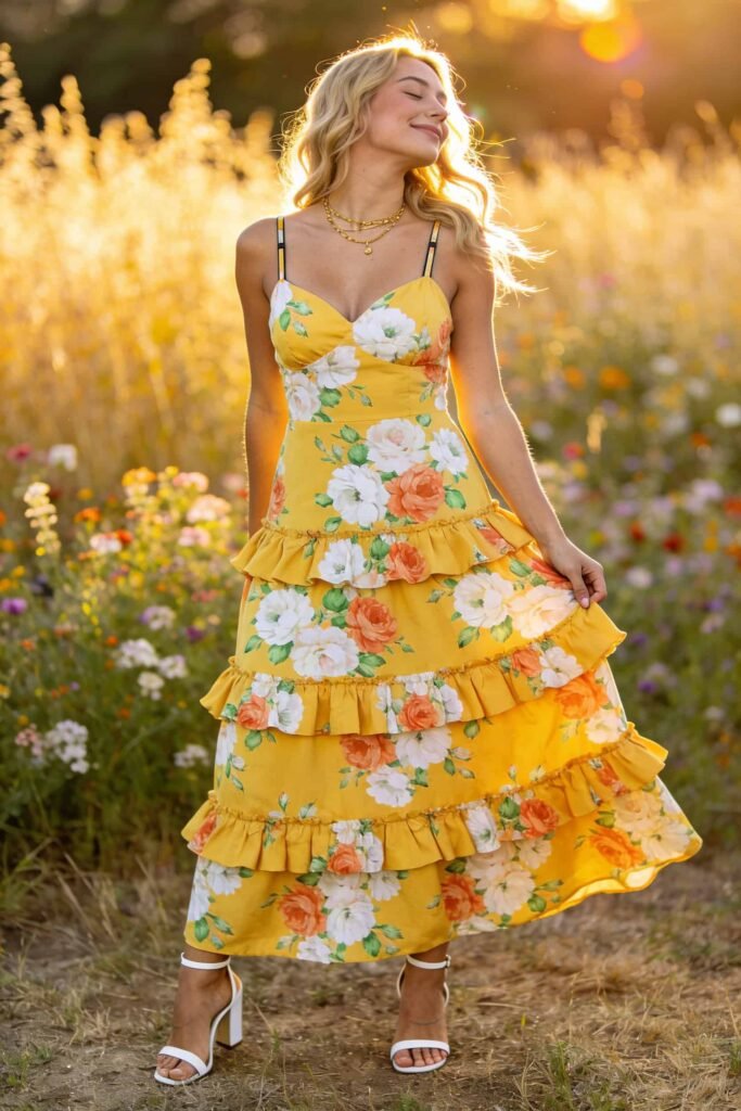 2. Lulus Soiree Perfection Yellow Floral Ruffled Tiered Maxi — The Joyful One