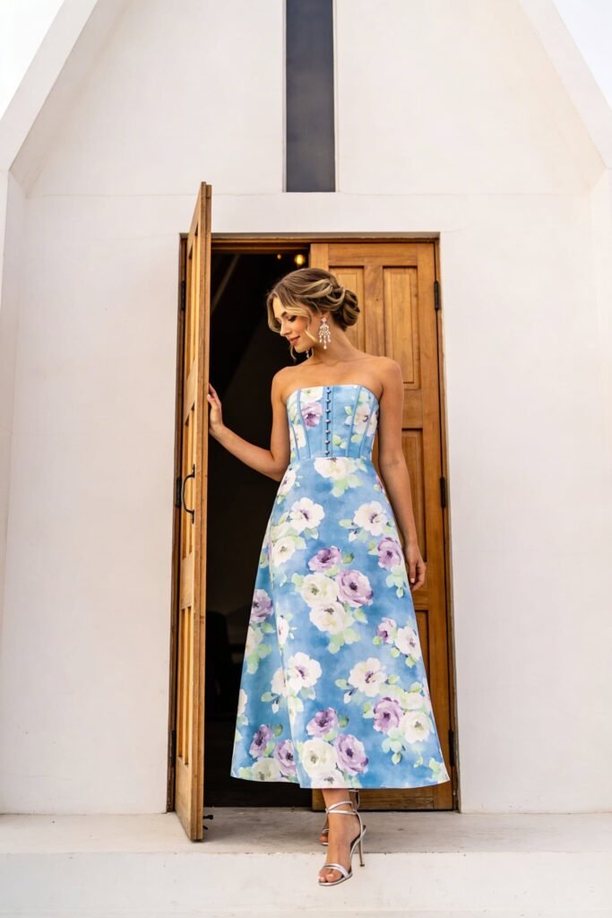 This dress is the showstopper. The strapless bustier bodice with boning gives incredible support and shape, while the light blue floral print creates a serene, elegant feel. The sweeping maxi length makes it perfect for formal and semi-formal weddings alike.