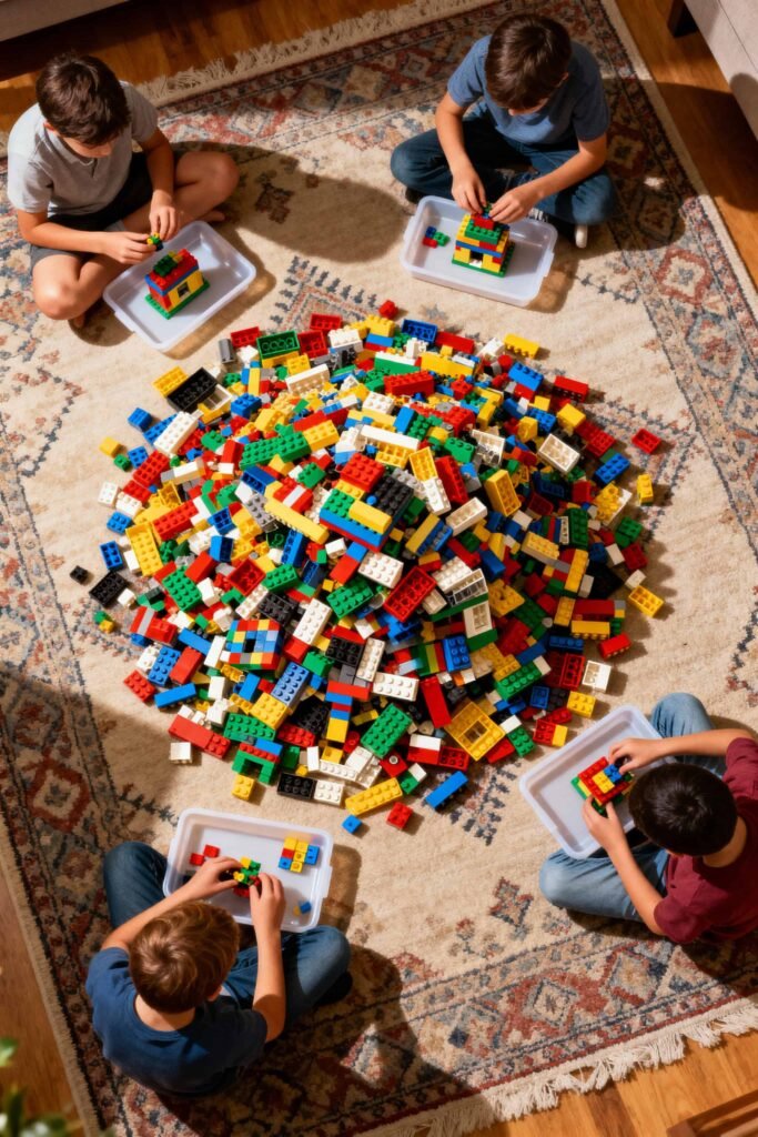 Dump a massive pile of bricks on a rug (or several trays). Give prompts like “Build the tallest tower” or “Build a monster,” and set a timer.