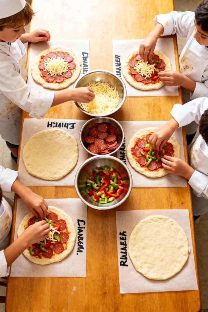 - “Pizzeria Pop-Up”: Kids design menus before cooking.