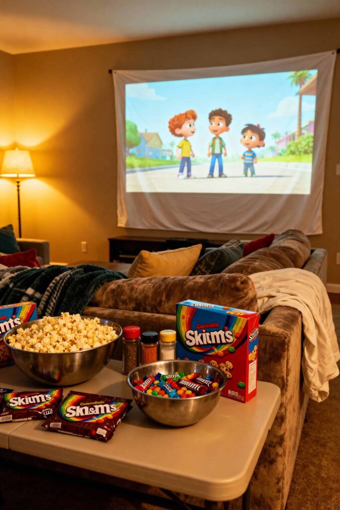This isn’t just watching TV. Rent a projector to display the movie on a blank wall or sheet. Create a “Concession Stand” with popcorn shakers (ranch, cinnamon, cheese) and boxed candy.