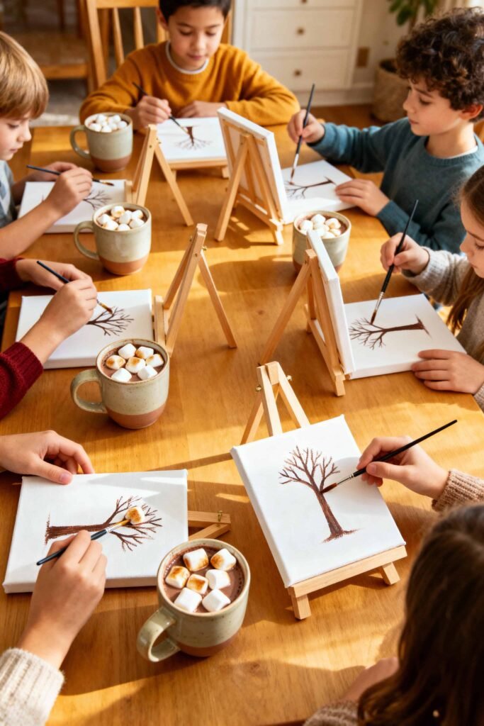 - What it is: A guided painting session with hot chocolate (or juice).
