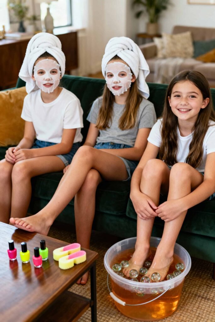 Set up stations: a foot soak (buckets with warm water and marbles), a face mask station (sheet masks or cucumber slices), and a mani-pedi spot.