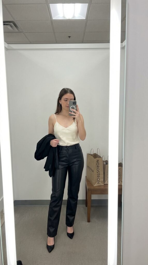 Agolde straight-leg leather pants (around $298 at Revolve) with a simple ivory silk cami. The contrast between tough and soft is everything. Throw a blazer over it if the venue is nicer.
