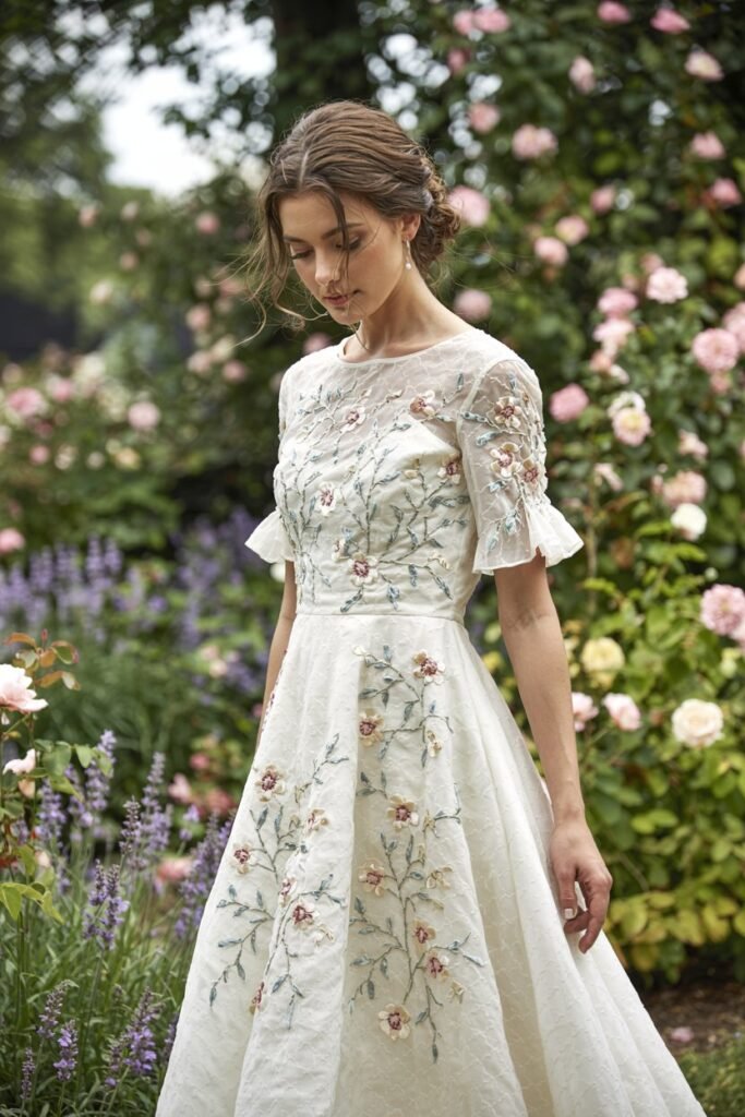 Key Details: Fully lined with built-in bra cups, intricate hand-embroidered details, structured bodice for support, mid-range alteration requirements.