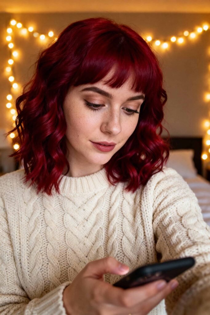 Key Details While Cherry Cola relies on a brown base, Cranberry Spritz leans into the red and violet spectrum. Celebrity colorists describe it as “bold and blended,” offering a brighter reflection that looks particularly stunning on curls or textured hair where the light can catch the varying red tones. It’s perfect for the peak holiday season (December–January). The technique often involves a root smudge for depth, but the mid-lengths and ends are saturated with cranberry and berry hues. It’s the visual equivalent of a flushed winter cheek—lively and energetic.