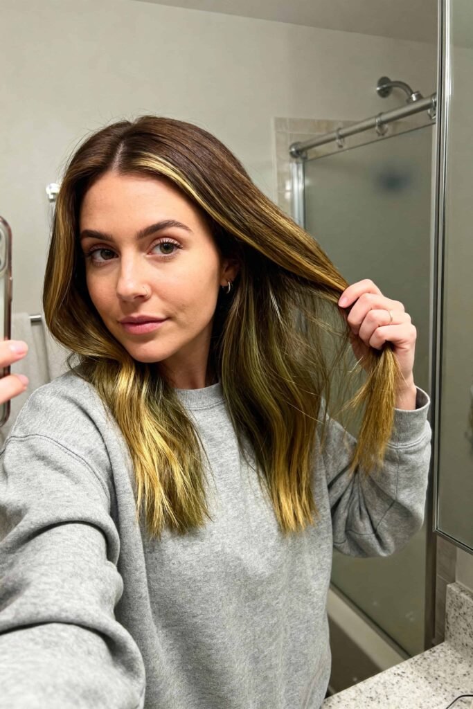 Key Details: This trend creates an “earthy yet expensive” look. For brunettes, it involves “tipping out” ends with warm gold; for blondes, it means adding deep golden lowlights. The olive-gold tone is distinct from standard ash or honey.
